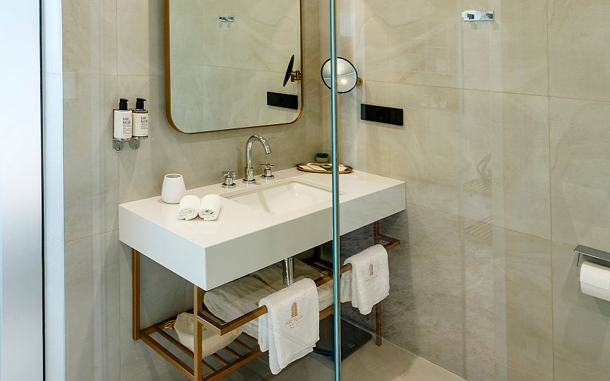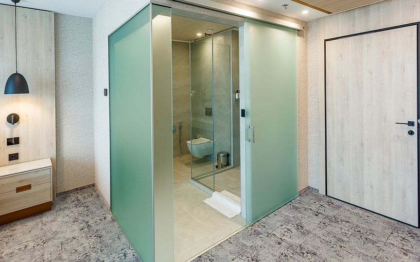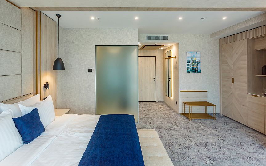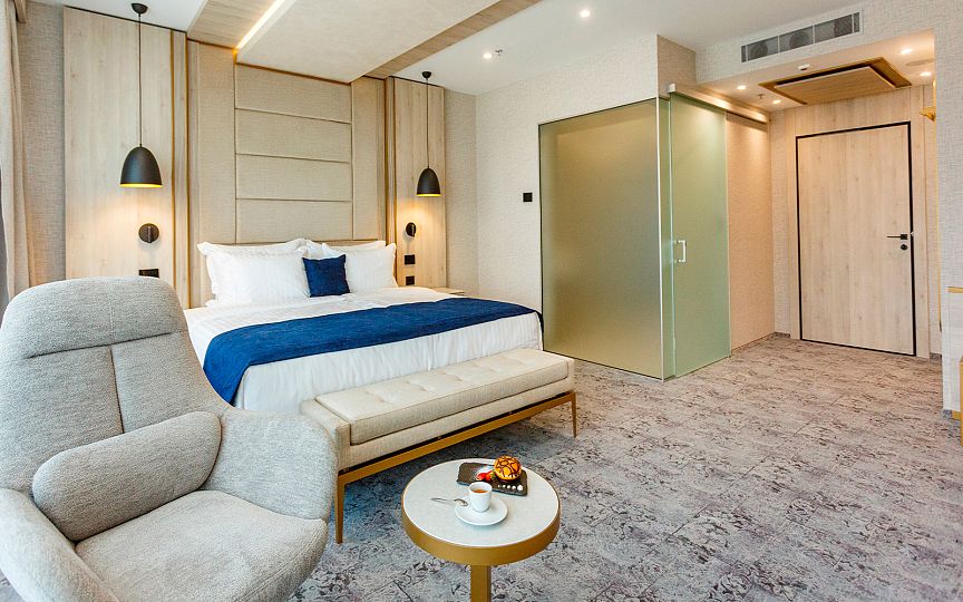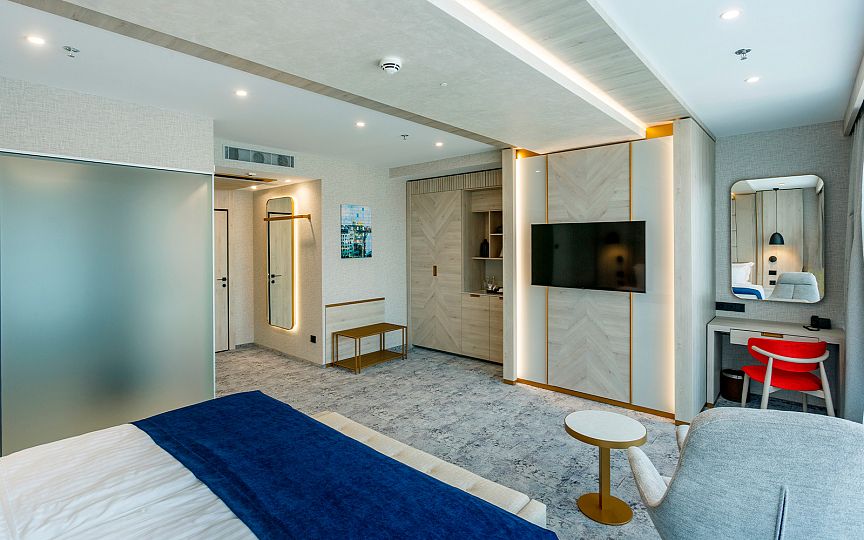 Стаята е модерно обзаведена, има просторна баня, а Smart системата в стаята ви позволява да управлявате осветлението, телевизията, озвучаването и климатизацията автоматично, от едно място.