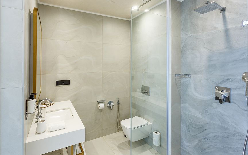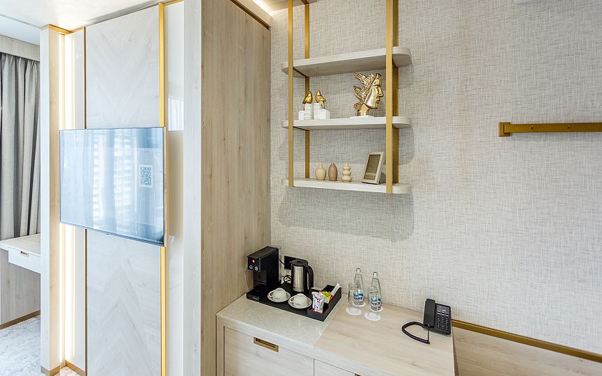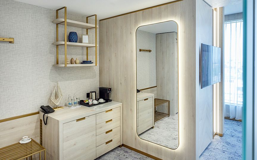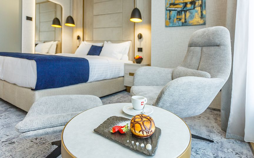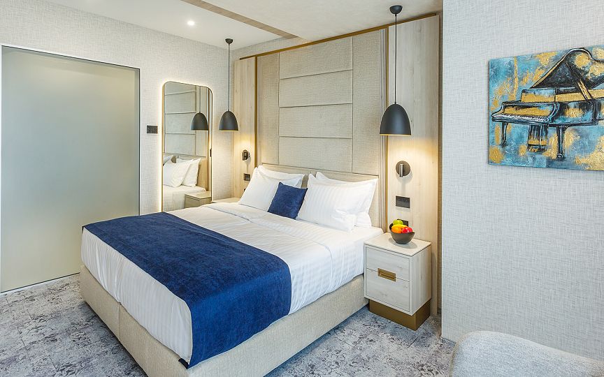 Стаята е модерно обзаведена, има просторна баня, а Smart системата в стаята ви позволява да управлявате осветлението, телевизията, озвучаването и климатизацията автоматично, от едно място.