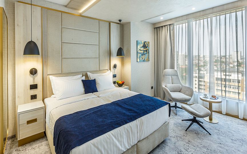 Насладете се на комфорт и елегантност в нашата Superior Room King & Twin City View. Разположени на високите етажи на Sky-High Floor, от 8-и до 12-и етаж, тези стаи осигуряват несравнима гледка към градския пейзаж на София, превръщайки всеки момент в незабравимо преживяване. Можете да избирате между просторно King-size легло или две отделни легла, гарантирайки си пълноценна почивка и спокоен сън.